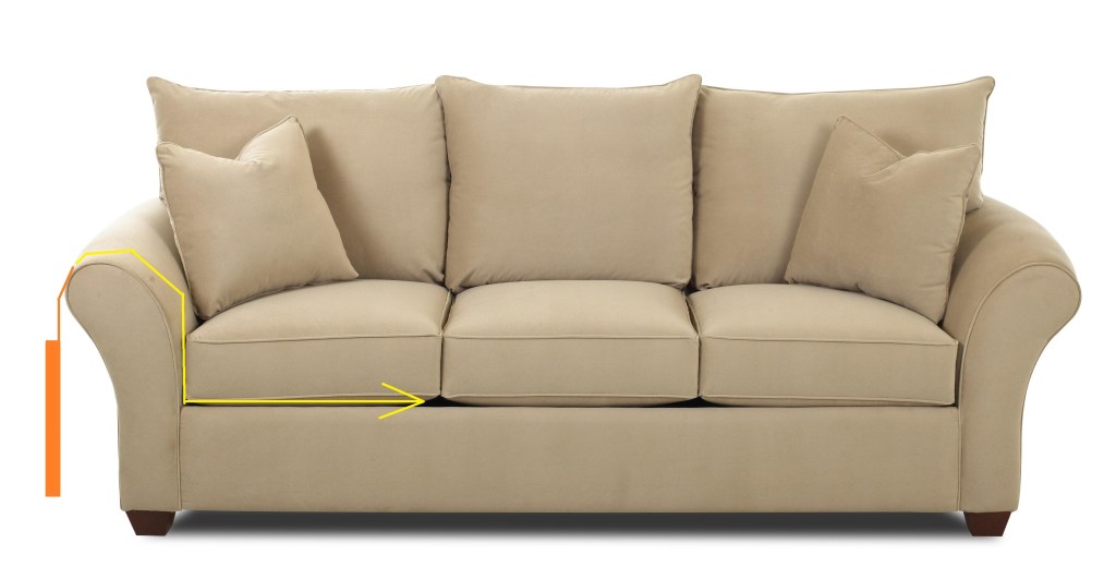 I wanted my sofa armrest organizer to sit at a certain height off the ground, but I also wanted the top half to also tuck underneath the couch cushion. I first measured how high off the ground I wanted my couch armrest organizer. Since I needed to hang it over the sofa armrest and then wrap back over the arm to tuck underneath the cushion, that left about 47 inches to tuck underneath the cushion.