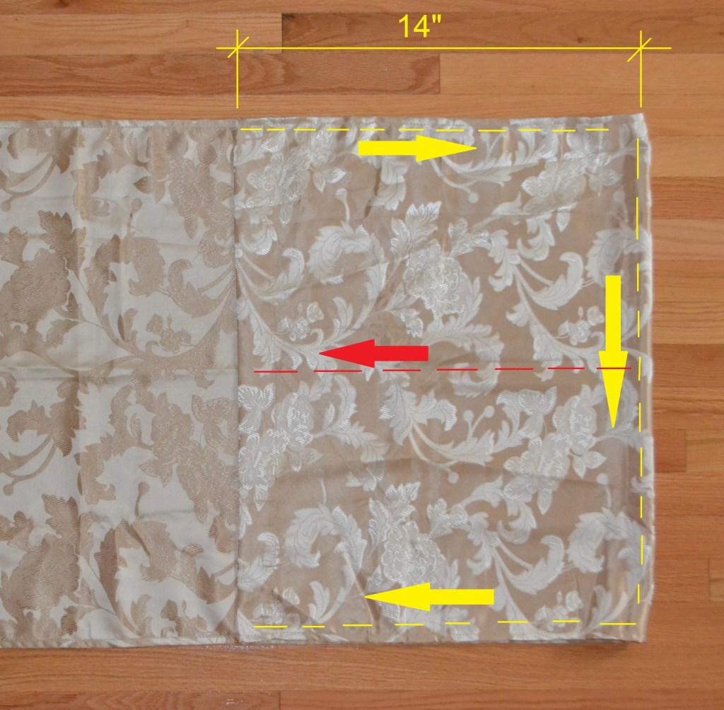 Using the same sewing method as the first design, I hemmed all of the edges of the fabric material, and then measured 16″ of material at one end. I folded up the 16″ material, sewed along the outside edges of the tall pocket (yellow arrows), which created a giant 16″ tall pocket.