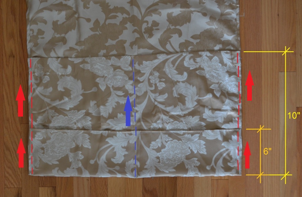 I then took the bottom 6″ of the pocket and folded it up, to create a shorter 6″ pocket at the bottom. This 6″ tall pocket also helped create the 10″ pocket behind the smaller pockets. I then sewed on both of the side edges of the fabric piece (red arrows) and then sewed a dividing line (blue arrow) to create a total of four pockets for this design. I sewed the edges of this design, all the way to the top of the pocket to reinforce the side edges.