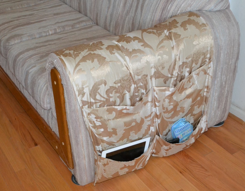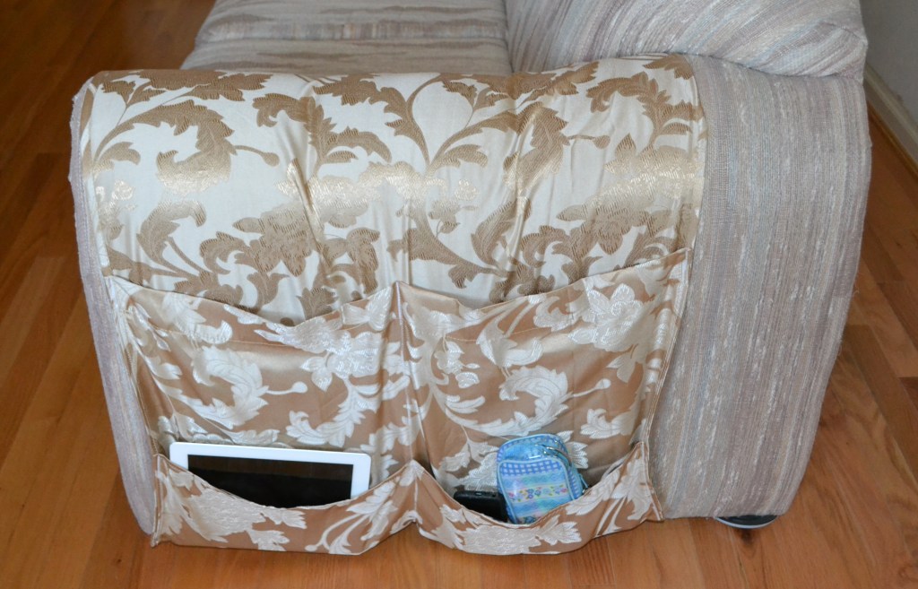Using the same method as the first sofa armrest organizer, I located where I wanted the organizer to hang on my armrest and I tucked the top half of it under the couch cushion on the end.