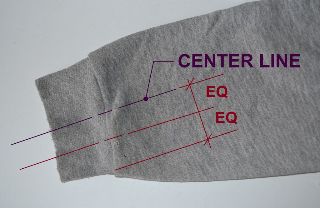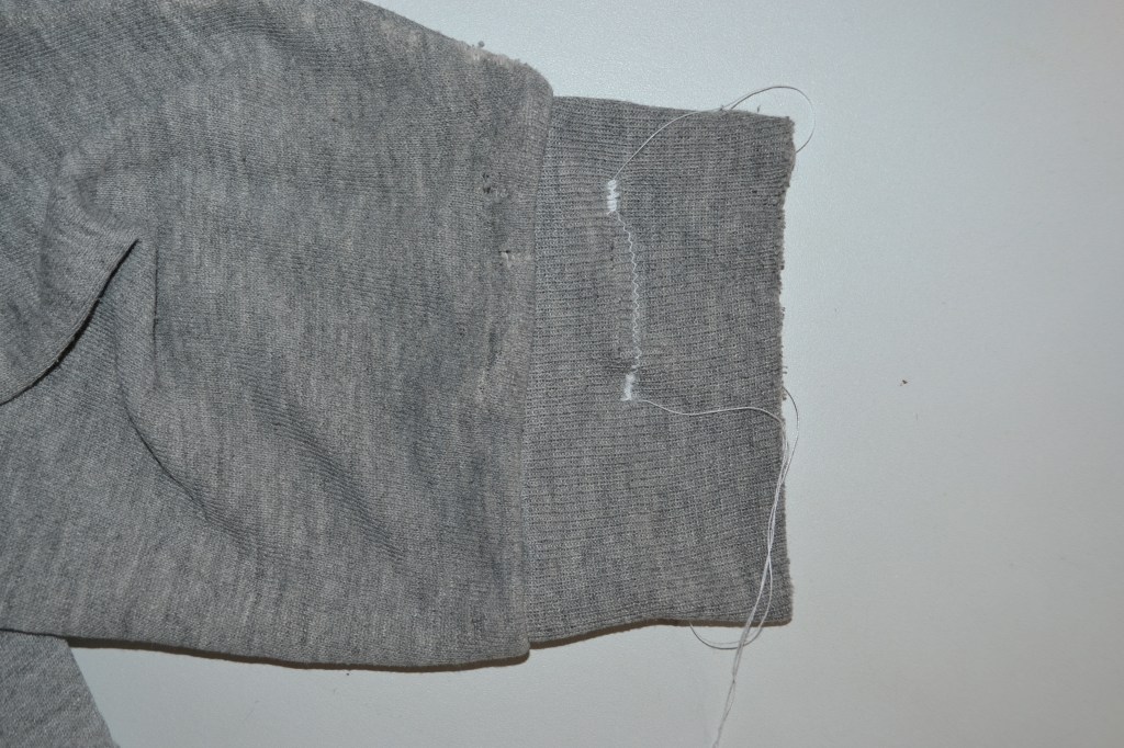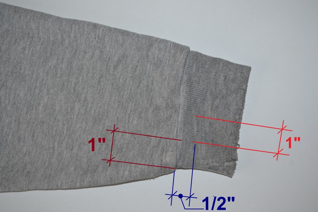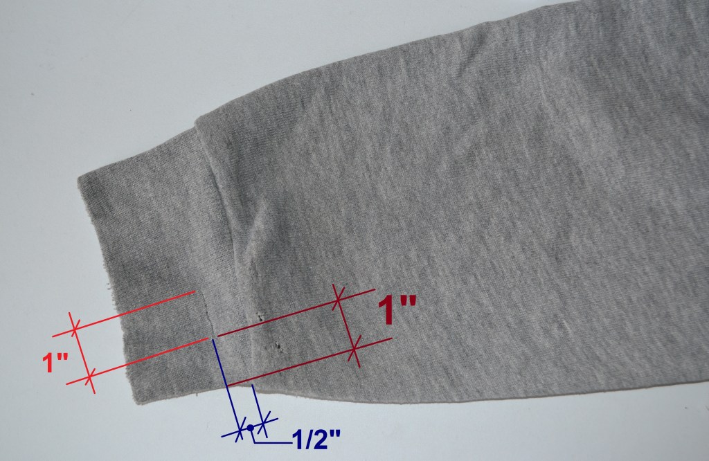 For my right sleeve, I used the same process as I did with the left sleeve. I located the center line of the right sleeve, and then located the center of the bottom half of the sleeve. I cut a one inch slit that was half an inch away from the bottom of the sleeve cuff.