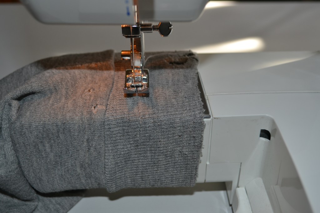 I removed my extension table in order for the sleeve to fit underneath the presser foot of the machine. I slid the left cuff over the needle plate and started to sew the edge of the thumb loop. I used a tight zigzag stitch, so the fabric would hold up during washes and use. Since I knew that these thumb loops would go through a bit of wear and tear, I used the back stitch lever to create a strong and permanent attachment at the ends of the thumb loops.