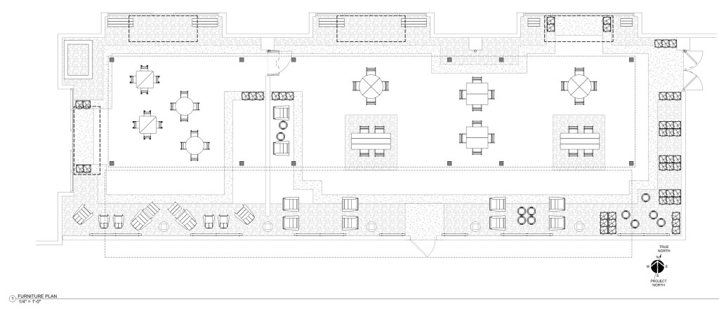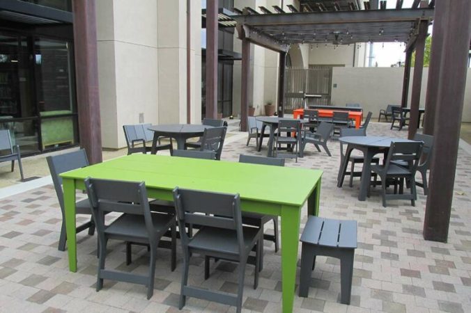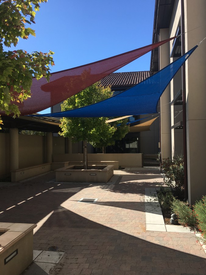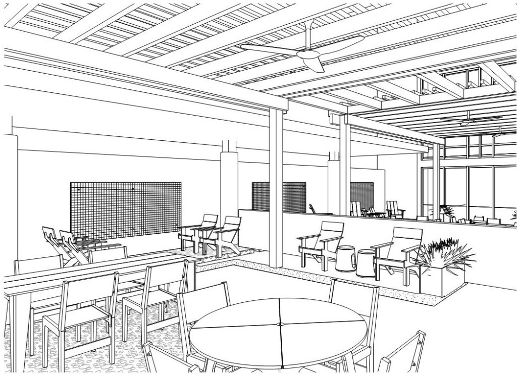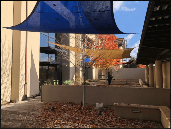- This project involves the installation of a new shade structure at the existing patio area south of the library. The new shade structures will replace existing fabric canopies. The scope will include new paving around existing paved areas, new plants, and new outdoor furniture for library users.