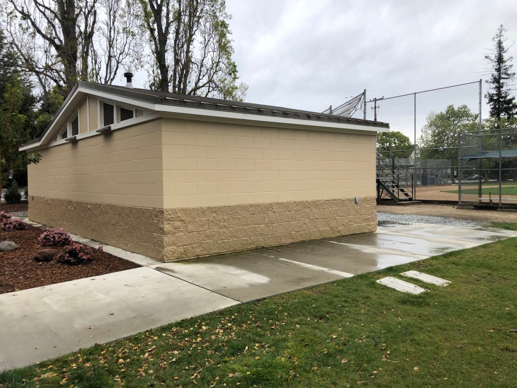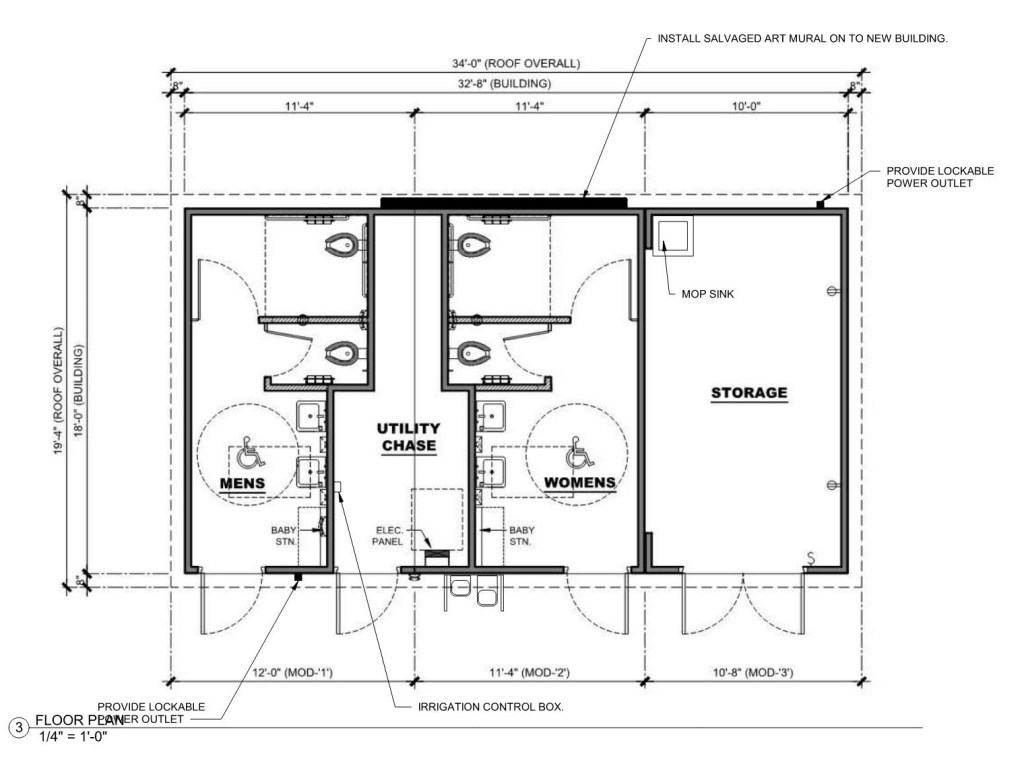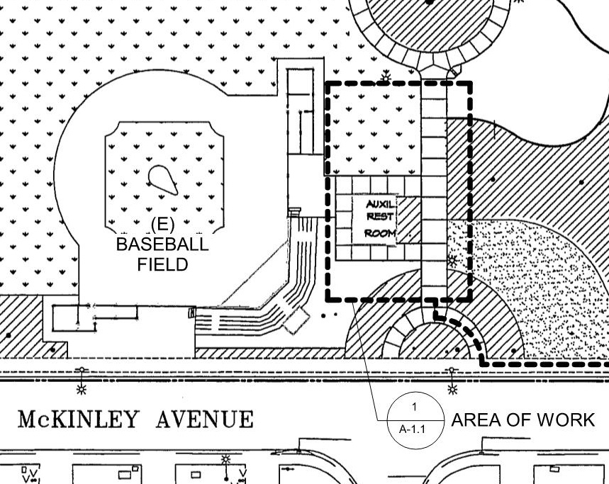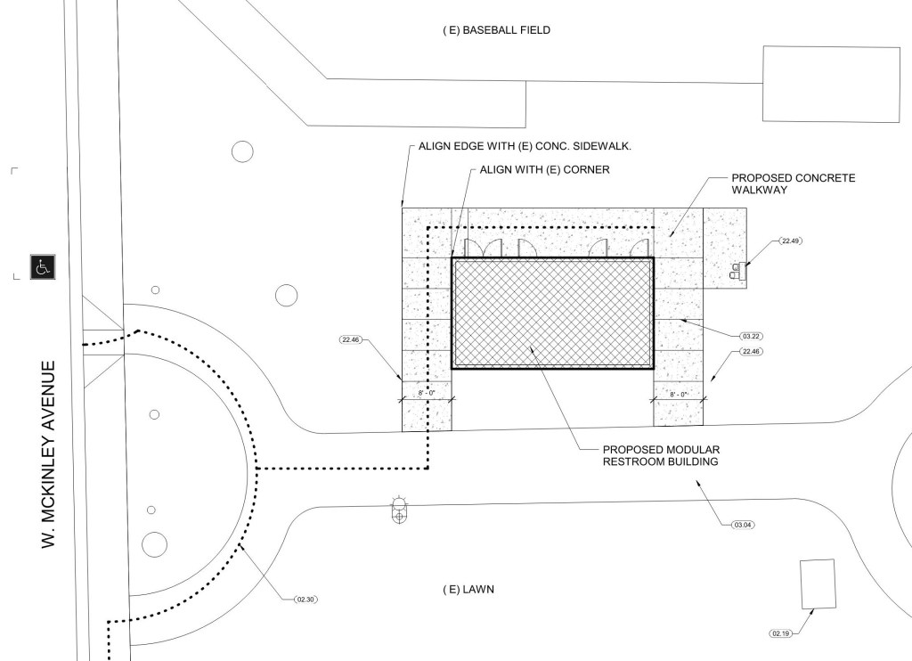 - The project involves the removal of the existing restroom building by the baseball field and the installation of a new restroom building containing two bathrooms, a utility chase and a storage room.